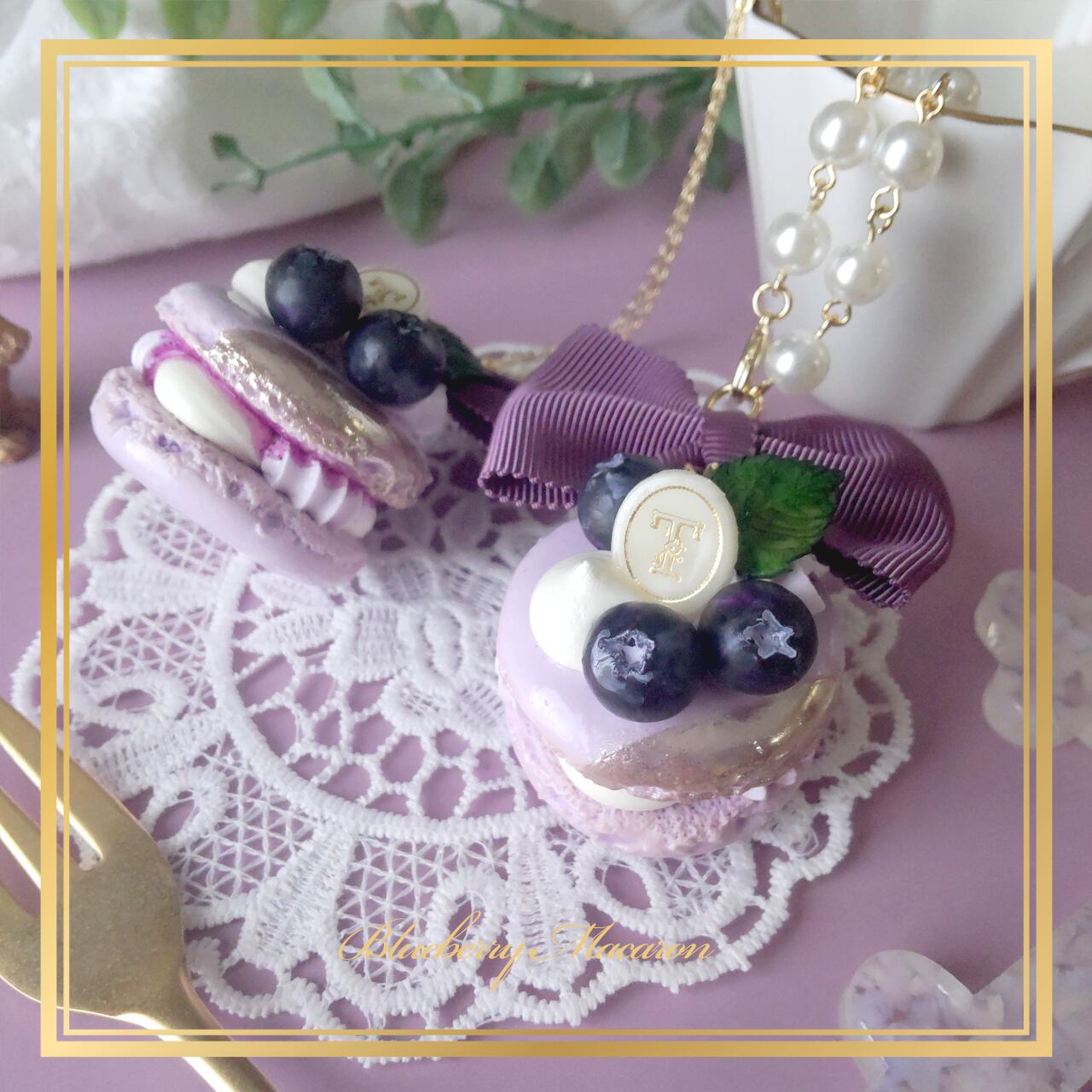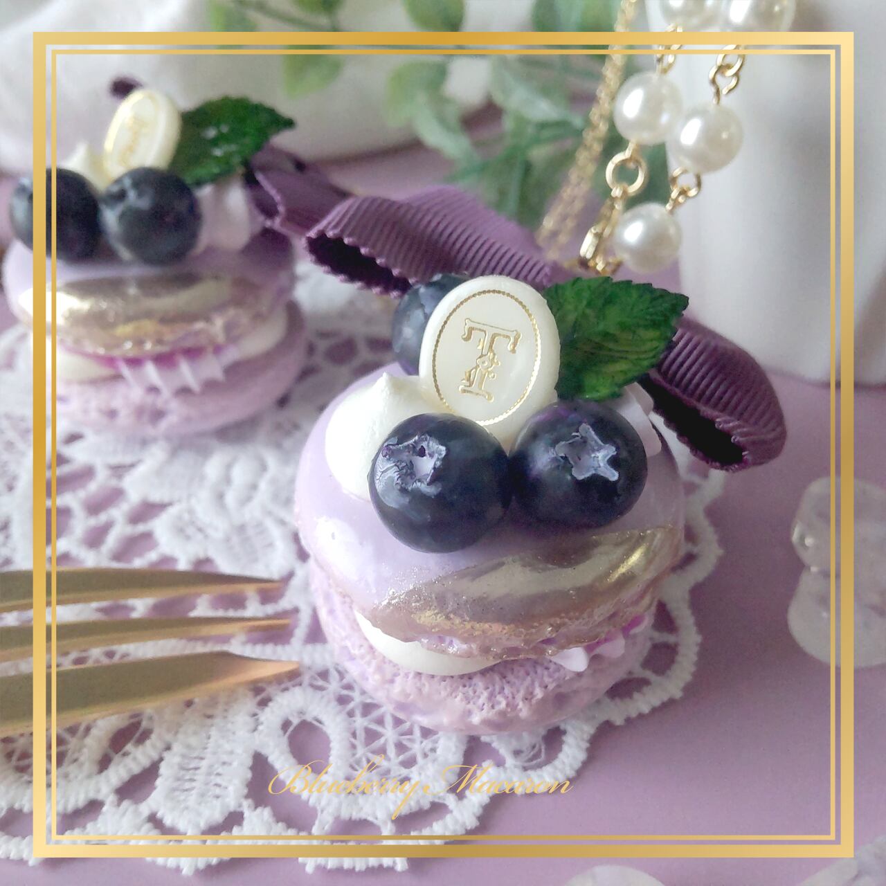 2種のクリームとブルーベリーソースをマカロンでサンドし、フレッシュなブルーベリーをトッピングしました。(葉っぱ部分は折れやすいので引っ掛かりにご注意ください。)