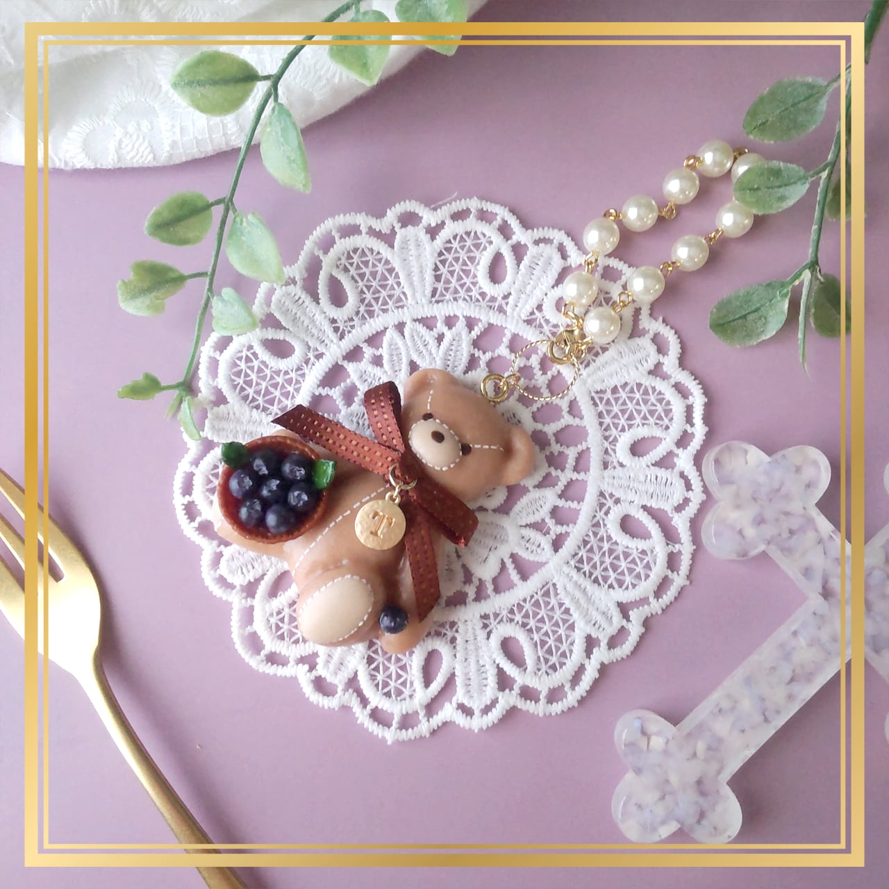 ブルーベリー狩りくまのバッグチャーム(ネックレス交換可)