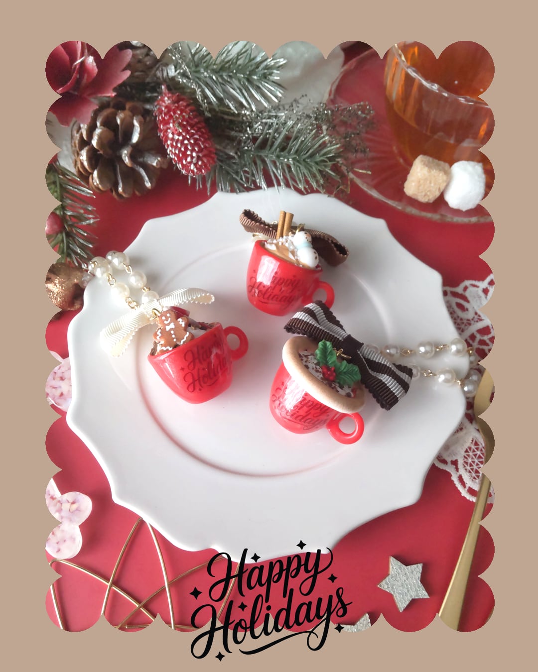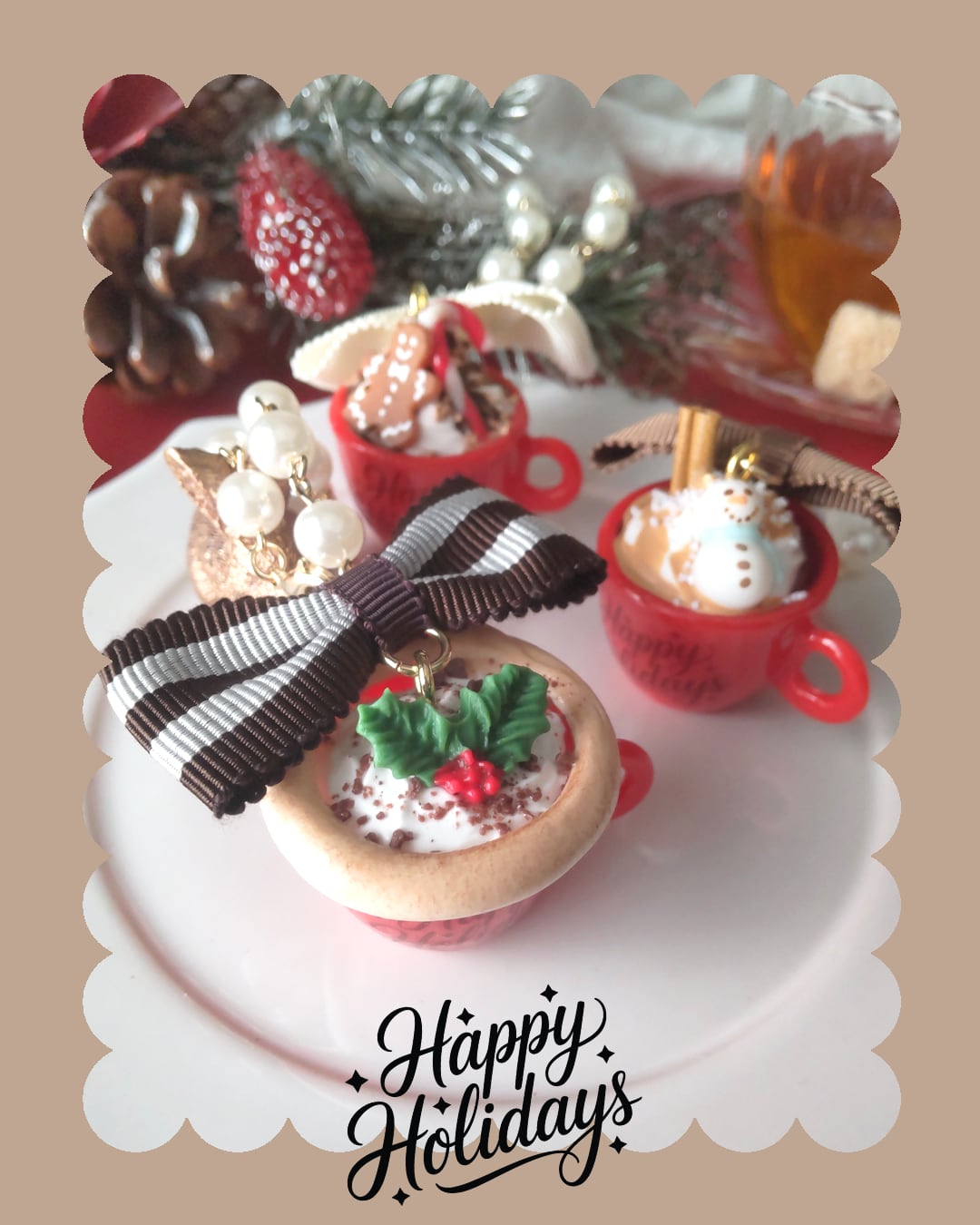 スノーマンのキャラメルラテ、焼きマシュマロとひいらぎのホットチョコ、ジンジャーマンのカフェモカの3種のホットドリンク。