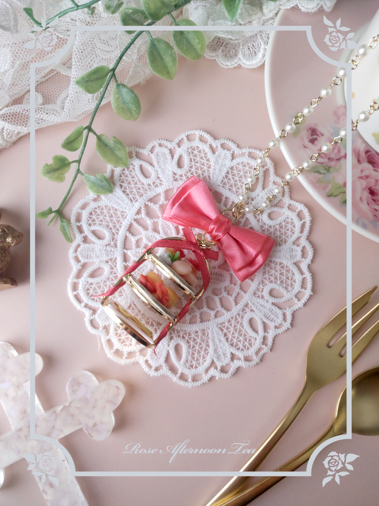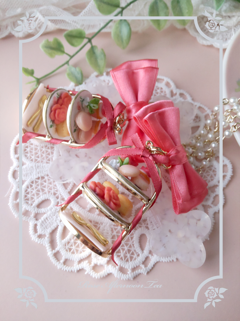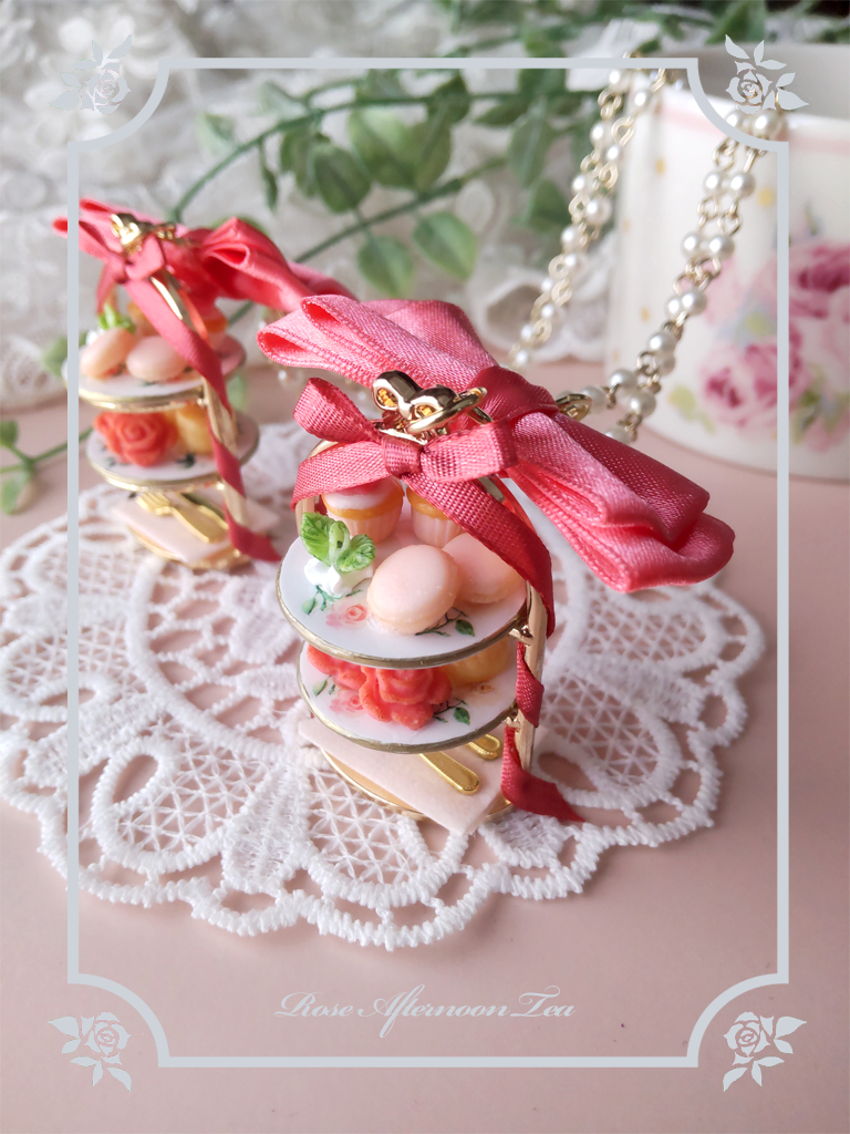 ローズ柄のアフタヌーンティースタンドの上にはスコーンやマカロン、カップケーキなどのスイーツが乗っています。繊細なつくりのアクセサリーですのでお取り扱いは特にご注意くださいませ。
