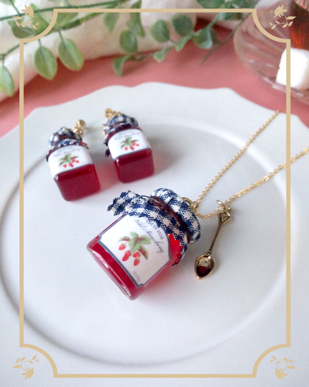 野いちごのジャムをモチーフにネックレスを作りました。お揃いのイヤアクセサリーもご用意しています(別売)。